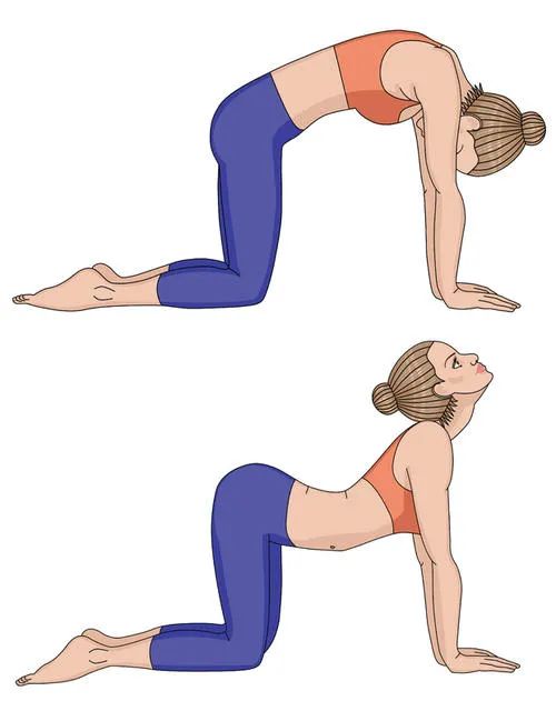 吸气,臀部向后向上提,胸腔向前推,脊柱延展,呼气,脊柱从骨盆开始一节一节向上拱起,上背部向上推,颈部放松