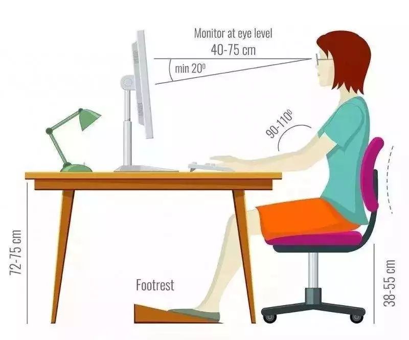 正确的坐姿应该是上半身保持颈部直立,使头部获得支撑,两肩自然下垂,上臂贴近身体,手肘弯曲呈90度,操作键盘或滑鼠,尽量使手腕保持水平姿势;