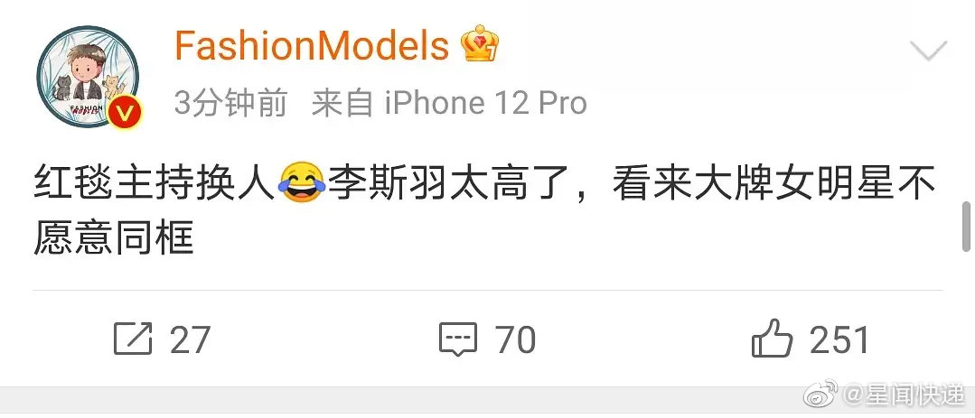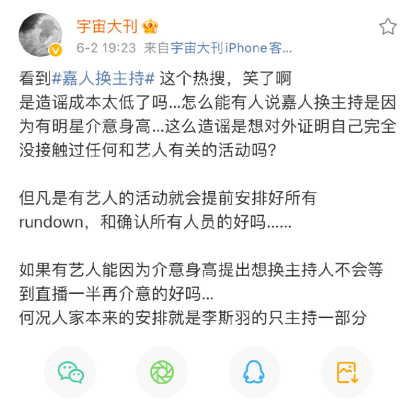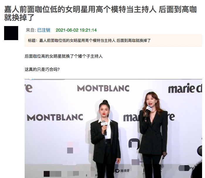 之后就有网友爆料,后面陆续登场的某些或者某位女明星(后续的都是大咖)不愿意了,觉得李斯羽太高了,要求换女主持。