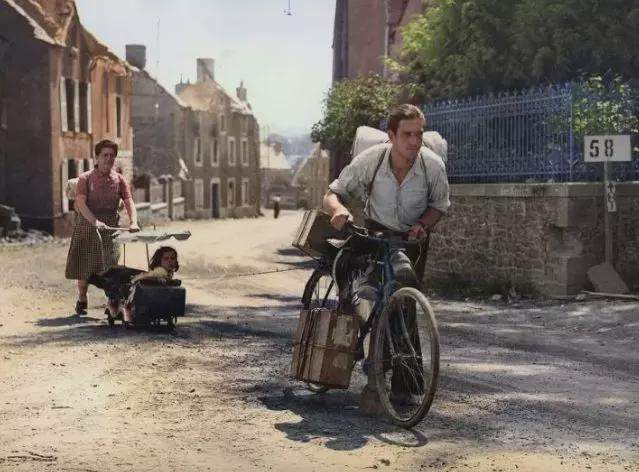 图为:1944年,二战全面爆发后,这是法国境内流连失所的难民,一名男子用自行车拖着行李,大街上的人寥寥无几。