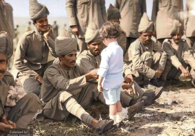 图为:1914年在法国马赛,一群印度士兵和一个法国男孩,他们正在和这个可爱的男孩开玩笑逗乐。