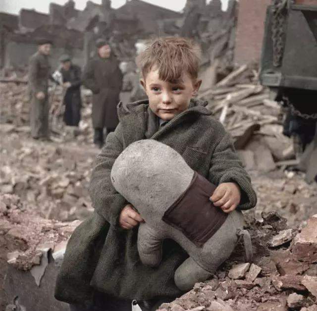 1945年,伦敦,失去家庭的男孩抱着一个毛绒动物玩具。