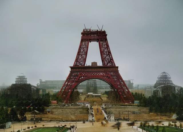 图为:1888年,在法国巴黎,建设中的埃菲尔铁塔,当时的铁塔仅仅建立一个底座。