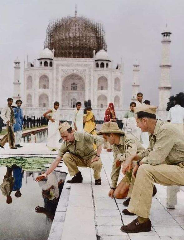 图为:1942年,印度泰姬陵旁边,几名士兵在谈论池子里的水。