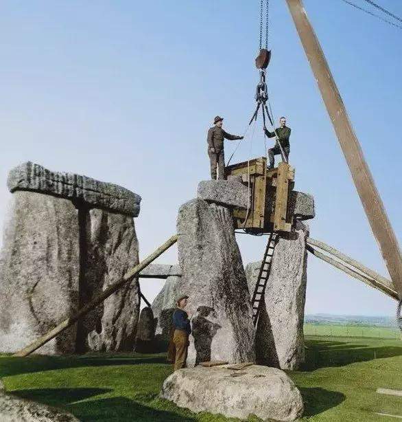 图为:1920年,正在施工的巨石阵。在英国伦敦西南100多千米的索巨石阵又称索尔兹伯里石环、环状列石、太阳神庙、史前石桌、斯通亨治石栏、斯托肯立石圈等名,是欧洲著名的史前时代文化神庙遗址。