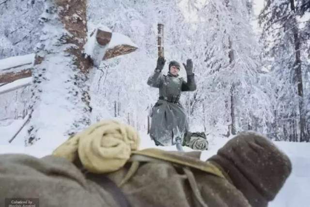 图为:1945年,在冰雪覆盖的丛林里,一名德国士兵举起双手来投降,这个时候已经是二战的最后时期。