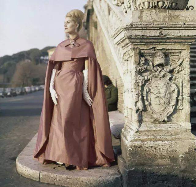 1962年1月11日,在意大利的罗马,一个模特穿着产自中国山东的蝉翼纱为原料制作的金棕色披肩。真实彩照。