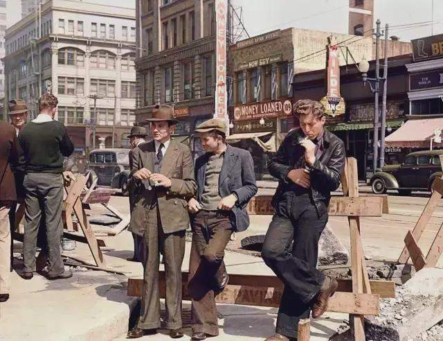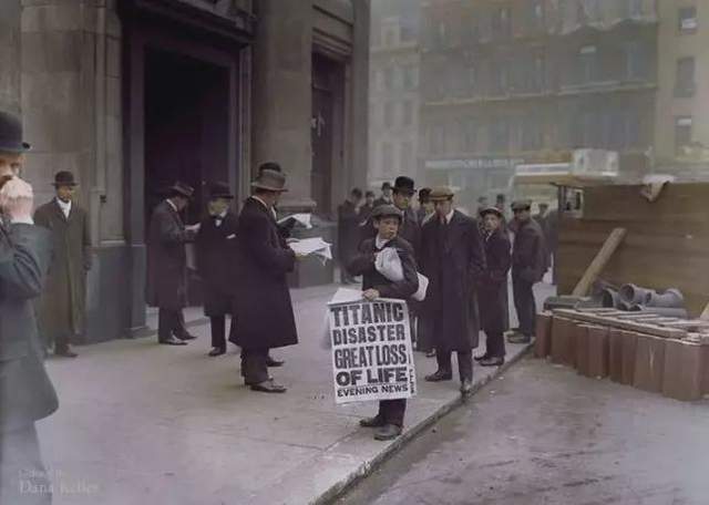 图为:1912年,泰坦尼克号沉没后的第二天,纽约大街上的报童正在卖报,每个人神情不一样地看着报纸,了解这一噩耗。