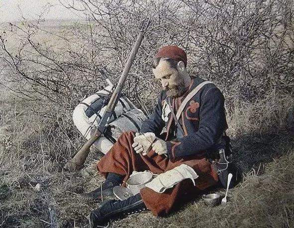 图为:上个世纪20年代初期,一名法国士兵准备就餐,身旁放着小婉儿和一支叉子。