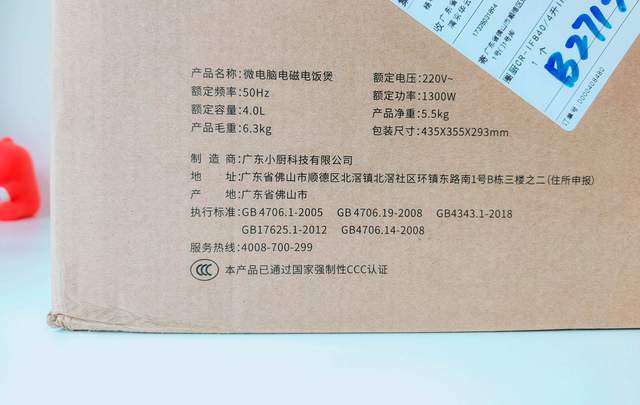 包装侧边同样具有有一份产品参数和一份食品接触用材料表。具体产品名称为微电脑电磁电饭煲,名字看起来有一股子玄学。额定容量为4L,额定功率为1300w,产品净重为5.5Kg,再者电饭煲行列中已经算是个“胖子”了。