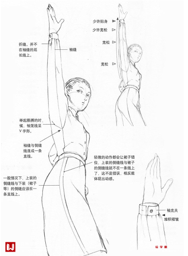 只要手掌朝外翻,就能看到袖缝的线条。袖子的扭曲可以通过袖针来表现。