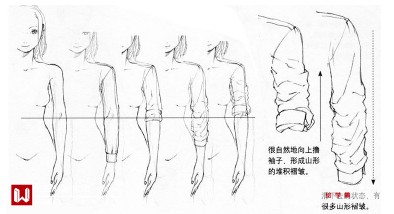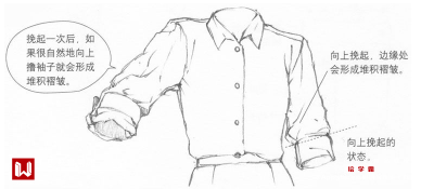 如果是很自然地进行向上撸袖子,就会逐渐形成山形的堆积产生褶皱。而袖子在滑下去的状态下,也会有我们很多因为山形褶皱。