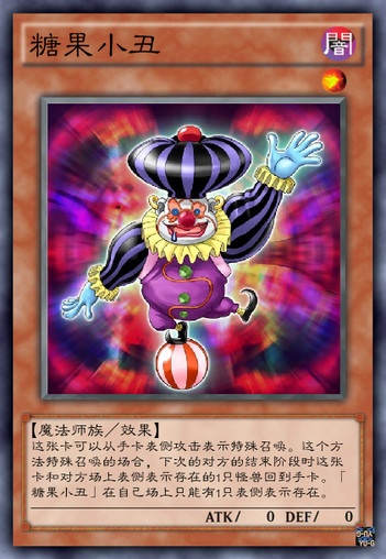 这张卡可以从手卡表侧攻击表示特殊召唤。这个方法特殊召唤的场合,下次的对方的结束阶段时这张卡和对方场上表侧表示存在的1只怪兽回到手卡。糖果小丑在自己场上只能有1只表侧表示存在。