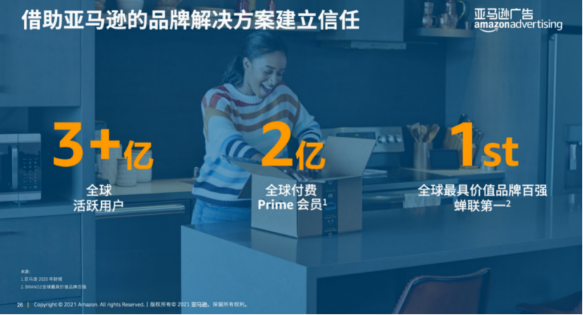 亚马逊具有全球超过3亿的活跃用户, 2亿全球付费Prime会员(10)。同时,亚马逊也连续两年蝉联世界最具价值的品牌百名品牌第一(11)。基于消费者对亚马逊的信任,亚马逊可以赋能给中国品牌去触达海外消费者,并和品牌进行互动和链接。