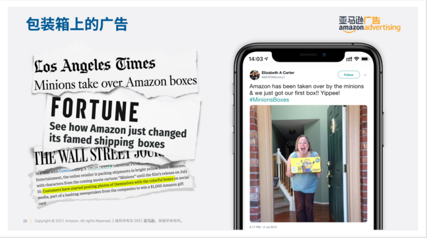 另外,我们非常注重用户的情感体验,比如在《神偷奶爸》电影上映的时候,亚马逊特别定制了小黄人快递盒,粉丝收到快递后,拍照发布到社交媒体网络上进行二次传播互动。这当时被很多媒体所报道,是亚马逊与消费者情感互动的一个形式。