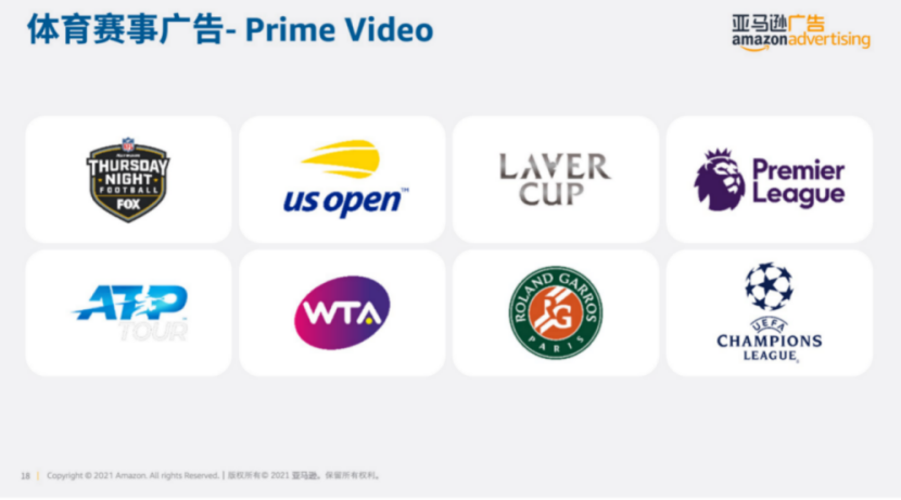 其实,亚马逊购买了很多体育赛事转播权,比如美国橄榄球大联盟、法国网球公开赛、美国网球公开赛、欧洲冠军杯等优质的体育赛事,在赛事的中场以及比赛前后都有一些非常好的广告资源,是可以供给中国品牌去和海外消费者互动的。