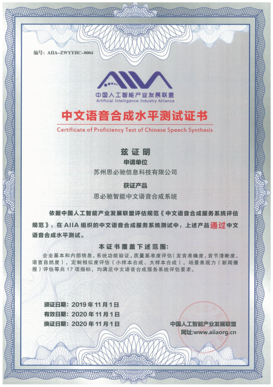 2019年11月,思必驰首批通过“中文语音合成水平测试”