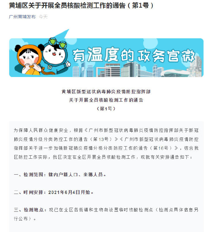 【 广州黄埔区全员核酸检测】广州黄埔发布微信消息,为保障人民群众健康安全,根据《广州市新型冠状病毒肺炎疫情防控指挥部关于新冠肺炎疫情分级分类防控工作的通告(第13号)》《广州市新型冠状病毒肺炎疫情防控指挥部关于进一步加强新冠肺炎疫情分级分类防控工作的通告(第16号)》,结合黄埔区防控工作实际,黄埔区决定在全区开展全员核酸检测工作,现就有关安排通告如下:
