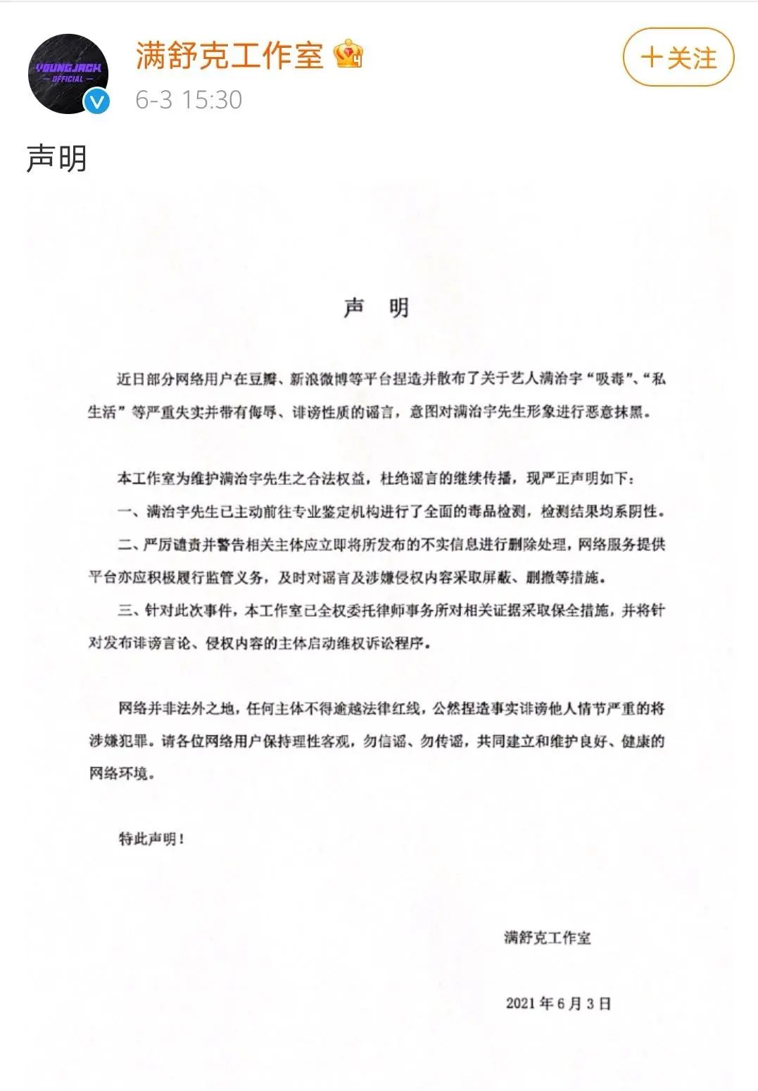 6月3日,满舒克工作室发布声明,称有关于满舒克“吸毒”“私生活”的言论为造谣。满舒克已主动前往专业鉴定机构进行了全面的毒品检测,检测结果均系阴性。工作室表示已全权委托律师事务所对相关证据采取保全措施,并将针对发布诽谤言论、侵权内容的主体启动维权诉讼程序。