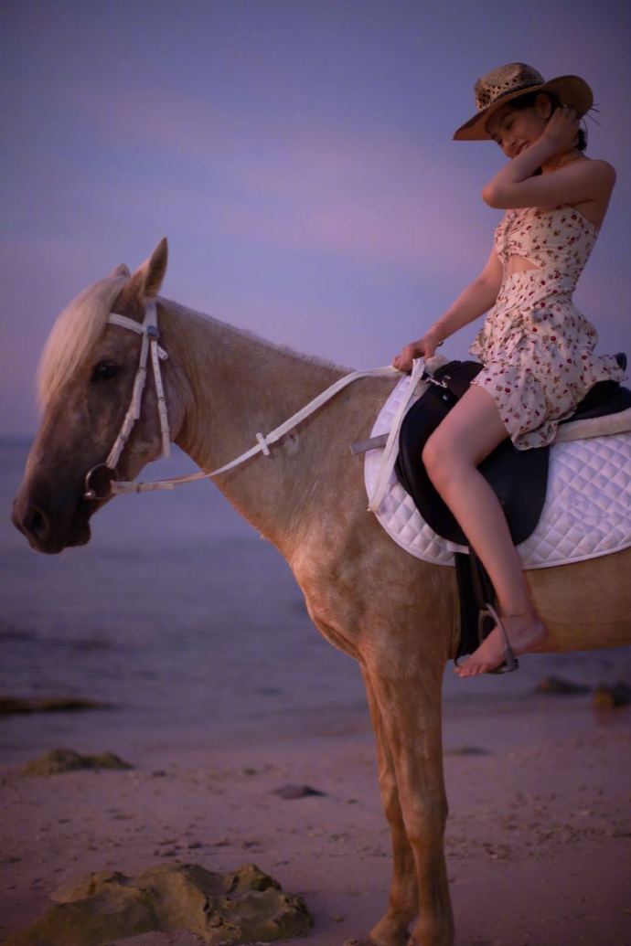 宋祖儿在社交平台晒出一组落日下骑马美图