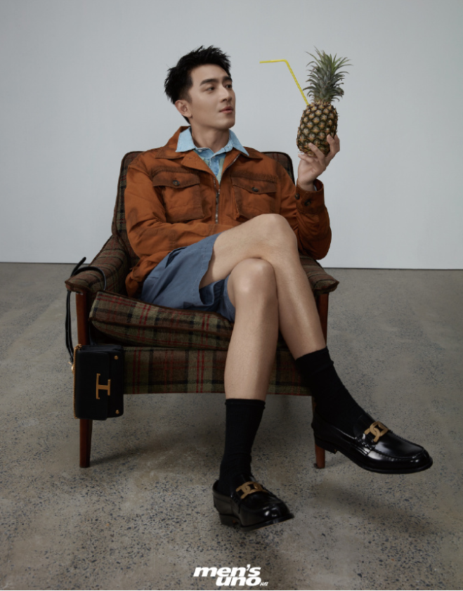 照片画面是灰色调,林更新的造型时髦雅致,他坐在格子沙发上,专注地看着手里拿着的一颗菠萝,他穿着蓝色短裤,黑色长袜和皮鞋,翘着腿,原来男人的腿也可以这么美,长长的,很好看;令人不由得发出感叹:当男演员拍照秀美腿,魅力与女演员不相上下!