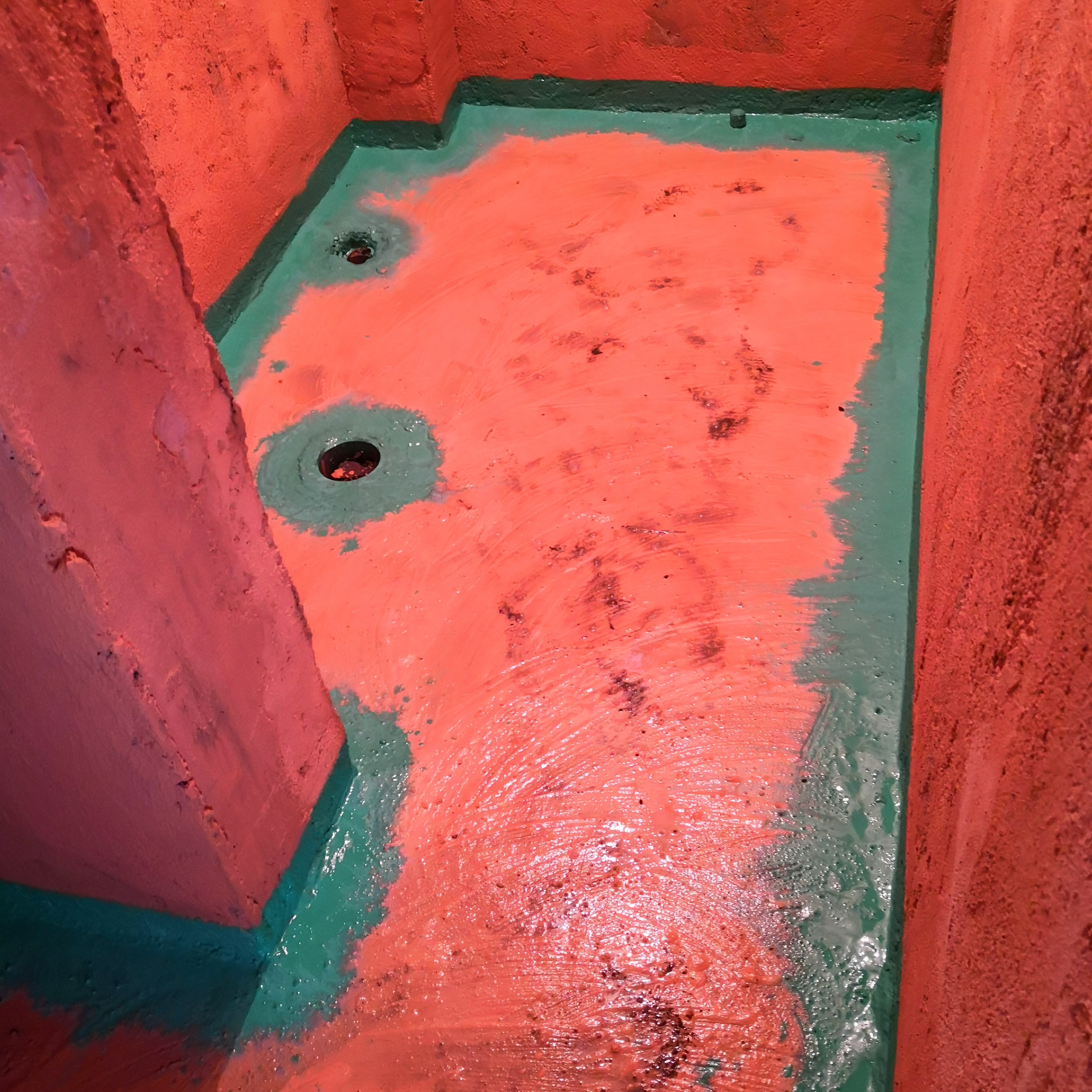 第2个施工点是淋浴区里是瓷砖,而外边是防水漆,同样的也是存在着一面墙上,内外两个地方的厚度不一样的情况。