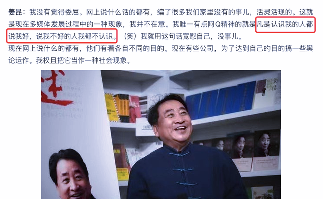 其实近些年来随着其他相声团体的兴起,姜昆也一直备受争议,在新书签售会结束后姜昆接受了媒体采访,谈到自己备受争议时,他心态特别平稳,称网上说什么的都有,编了很多没有的事,但是自己并不在意,而且凡是认识他的人都说他好,说他不好的,自己都不认识。