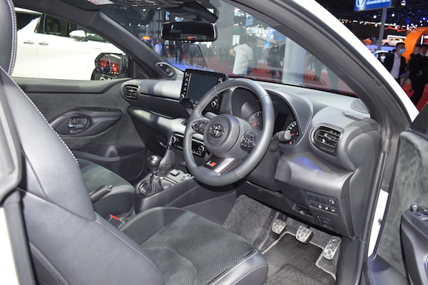 Yaris(参数|图片)是三门掀背式结构,宽体设计非常明显,长度仅为3995mm,轴距2560mm,宽却达到了1805mm,并且全部配备18英寸的轮毂。该车有三种颜色可选,分别是黑白红。该车的很多方面都可以看到丰田专属的GR字样,比如方向盘、仪表盘、座位后方等等,这也表明了它的身份与众不同。该车的座椅也是跑车化的风格,拥有较强的包裹性,可以胜任激进的驾驶操作。