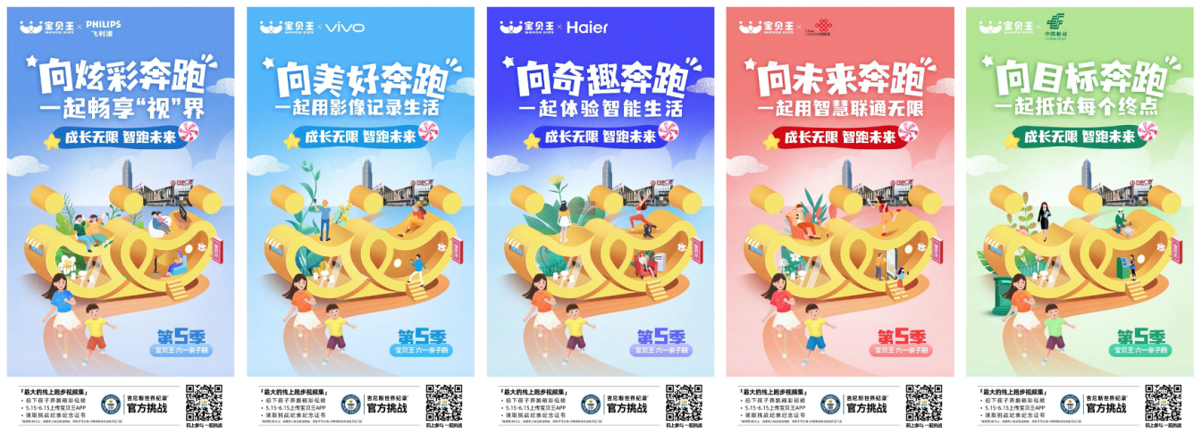 同时宝贝王在线上发起“品牌联盟”招募,以奔跑为主题,“向XX奔跑,一起XX”为固定句式,设计主题联合海报,吸引联通、海尔、联想、vivo等超50家知名品牌集体为六一亲子跑打call助力;5年来,累计吸引上百个知名品牌跨界联合,互相助力,共同打造一场品牌盛宴。