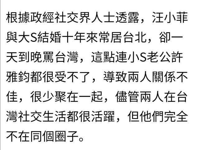 这几年,他越来越难以掩饰对台湾的不满,一家人分几个阵营,据说小S老公也不跟他玩了。