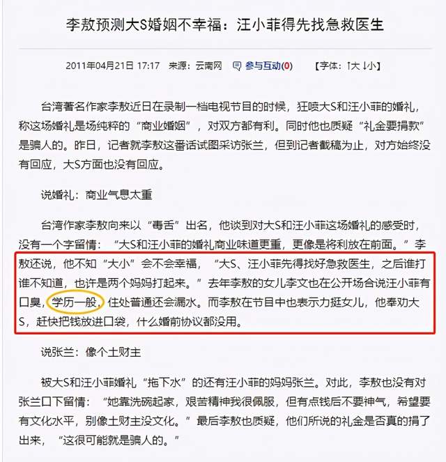 婚宴发言环节,汪小菲老妈张兰上台致辞感谢王思聪家提供婚宴场地,转头思聪就在微博直言“并不认识他们”;搜狐老大张朝阳将混乱的现场照片流出,大S汪小菲当天就提告搜狐……