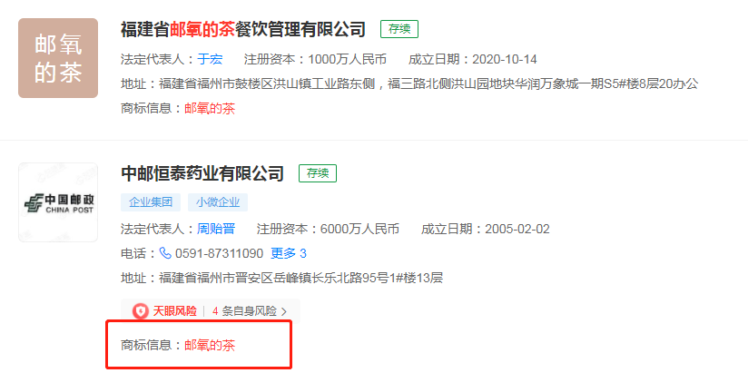 开奶茶店,中国邮政已酝酿许久。天眼查显示, 邮氧的茶运营主体为福建省邮氧的茶餐饮管理有限公司,成立于2020年10月, 注册资本为1000万人民币,经营范围包括外卖递送服务、食品经营、城市配送运输服务等。随后的11月,中邮恒泰药业有限公司已经申请注册“邮氧的茶”商标,该公司的最大股东中邮资本正是由中国邮政集团全资控股。