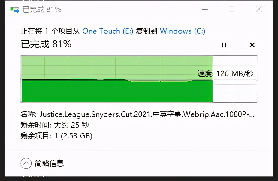 在读取测试中,同样使用这部电影,读取速度一样保持在了126MB/s左右,开始到结束的过程同样保持稳定,没有出现断崖掉速。