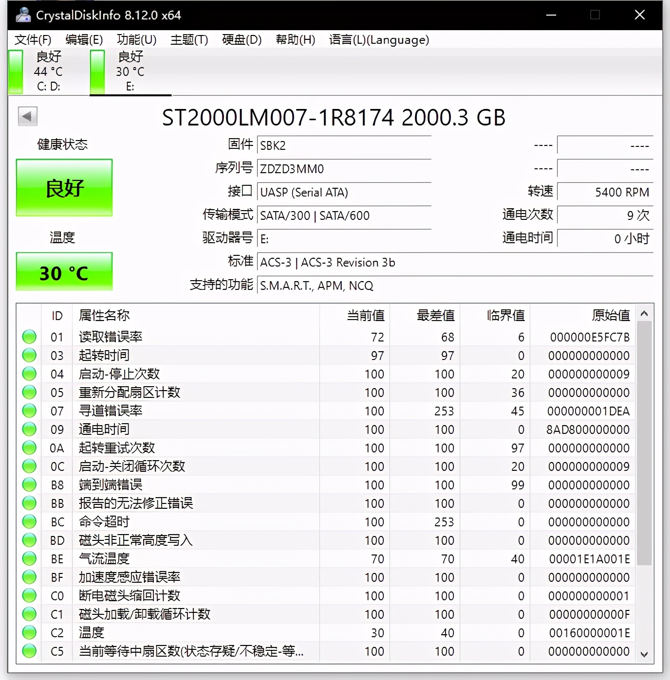 通过检测工具,可以看出,这款希捷铭系列移动硬盘我的型号为ST2000LM007,转数为5400转。通电时间0小时,次数9次?然后想了下,我就查了一次,那剩下的8次,难道是厂家在发货前验机了?
