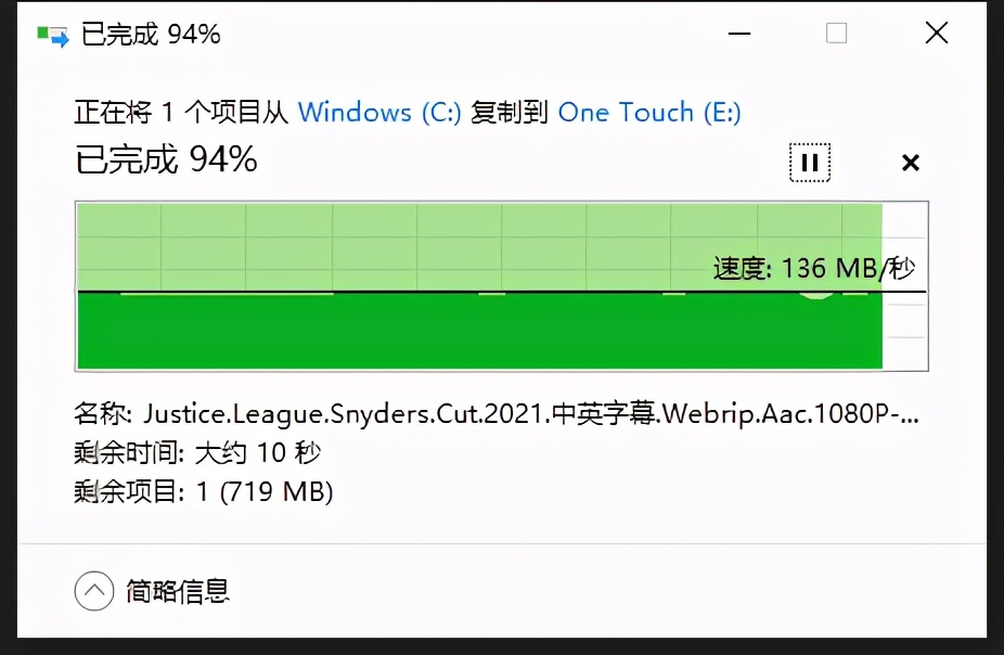 最后是日常使用的文件拷贝速度,在将硬盘放平稳后,开始通过一个在写入的情况下,开始进行写入一个13.3G的电影,写入过程中,速度从开始到结束前都保持了平稳130MB/s左右的写入状态,没有出现断崖掉速的情况。
