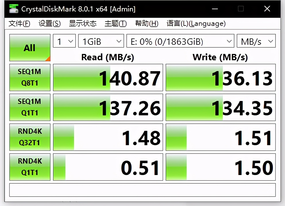 然后是测速环节,首先是连续写入和读取,通过测速软件CrystalDiskMark测试这款移动硬盘的写入速度为136m/s,读取速度为140m/s,这样的速度对于机械盘来说处于正常水平。
