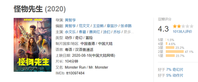 然而四年过去,余文乐上一部网播的电影《怪物先生》。两个影后惠英红、春夏+一个影帝涂们,最后豆瓣4.3的评分,观众评价余文乐的演技,毫无长进。