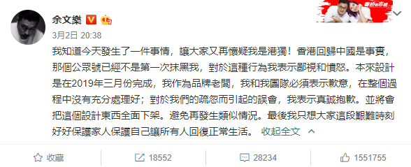 事情还没完,接下来,又有网友发现余文乐自制品牌的服装上印有疑似涉独的手势,引发网友热议。余文乐发文回应说:“(中国)香港回归中国是事实,那个公众号已经不是第一次抹黑我,对于这种行为我表示鄙视和愤怒。”