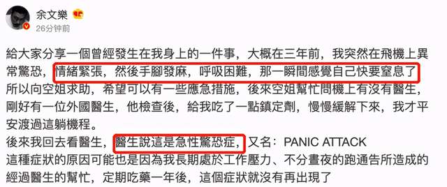 唯一区别于陈老师的是,6月2日,余文乐发长文透露自己患急性惊恐症,此前吃了一年药才没出现症状,前几天又突然发作。他还呼吁大家“在工作过程中劳逸结合、注意睡眠、减轻压力,多做一些户外运动,愉悦自己的心情”。