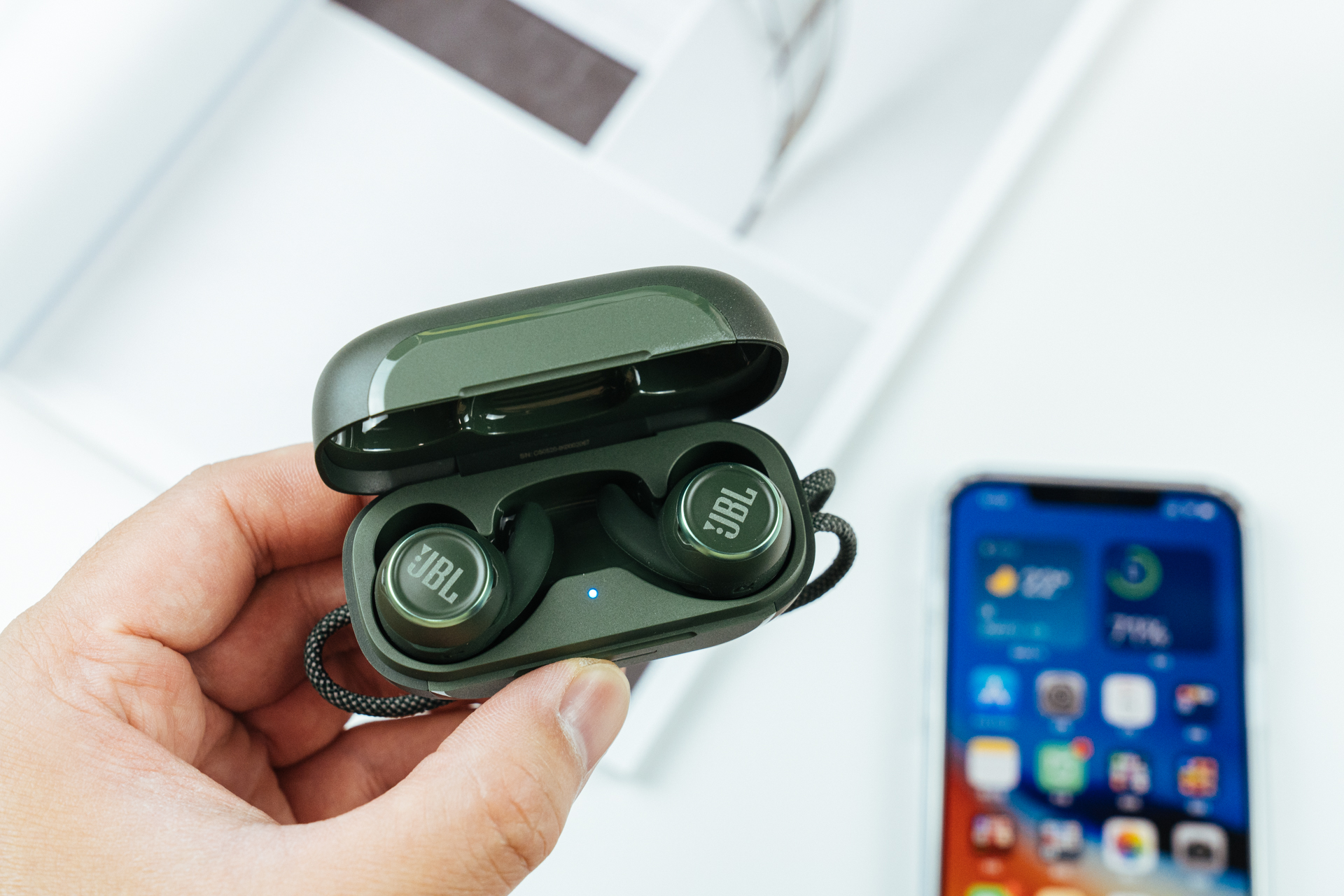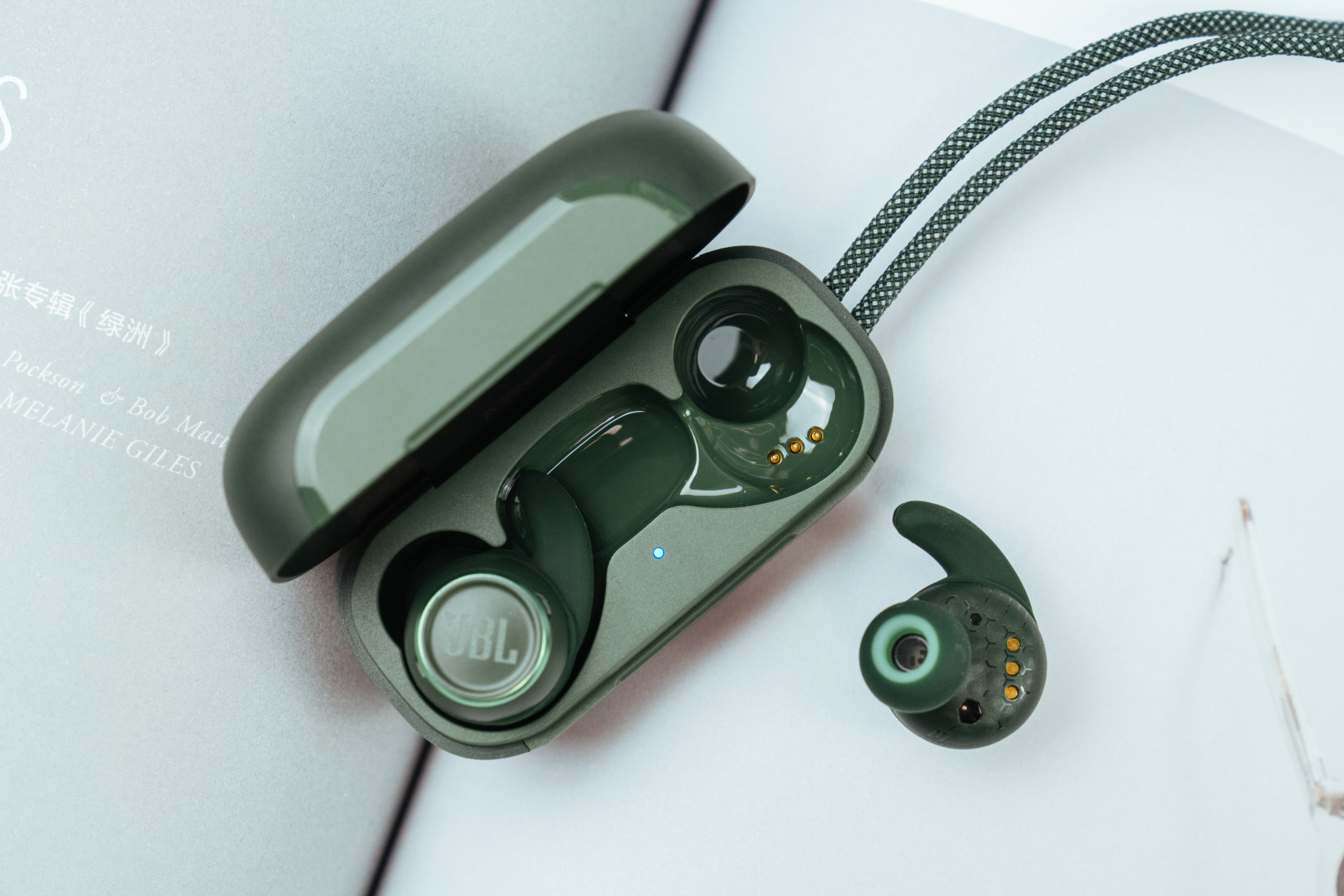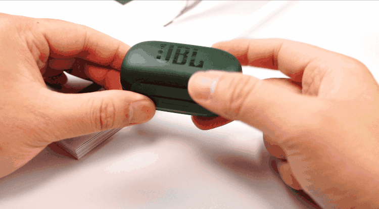 充电仓盒正面印有JBL铭牌,仓盒表面磨砂层,手感方面细腻,会比亮面材质更耐抗划痕。