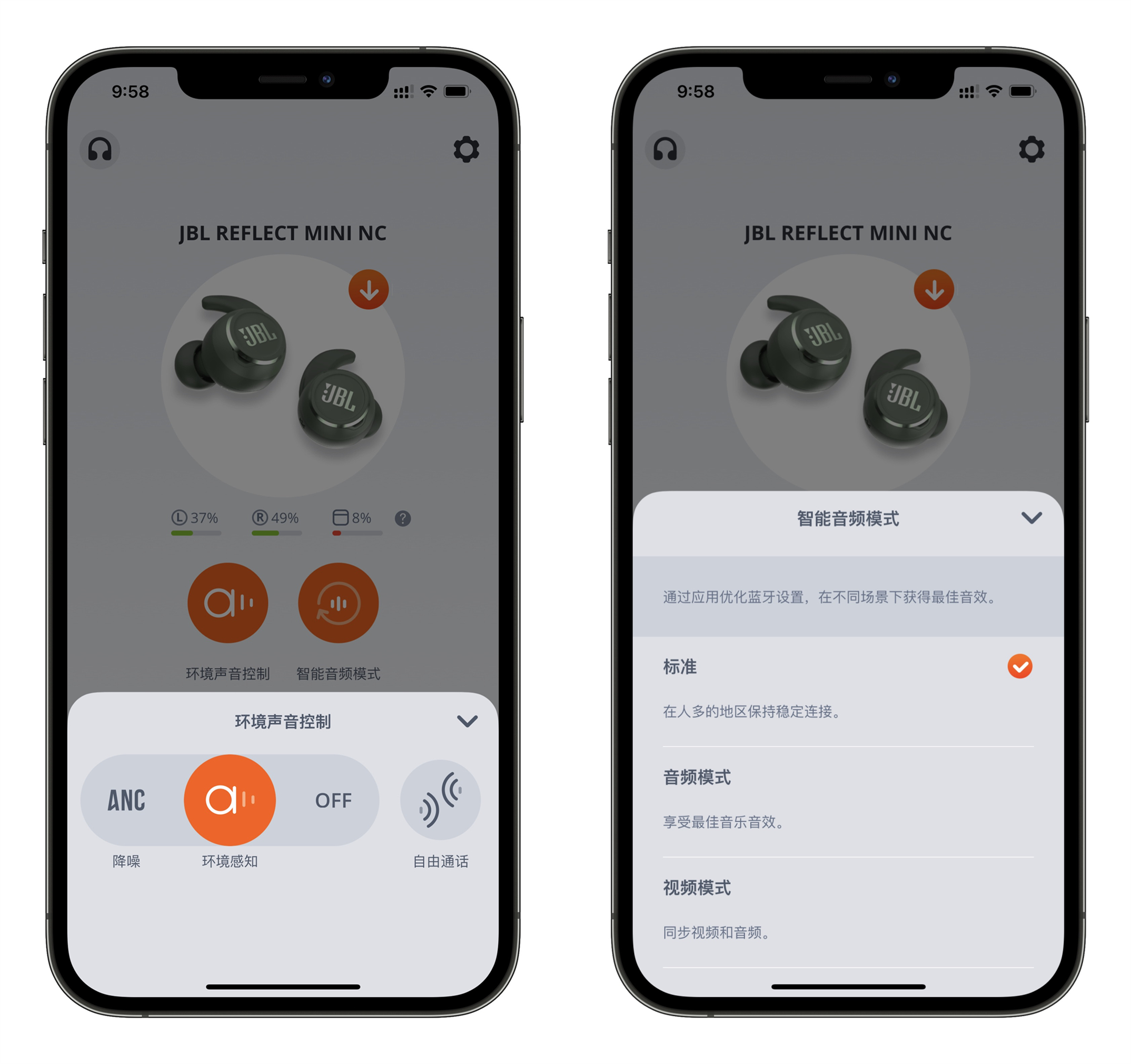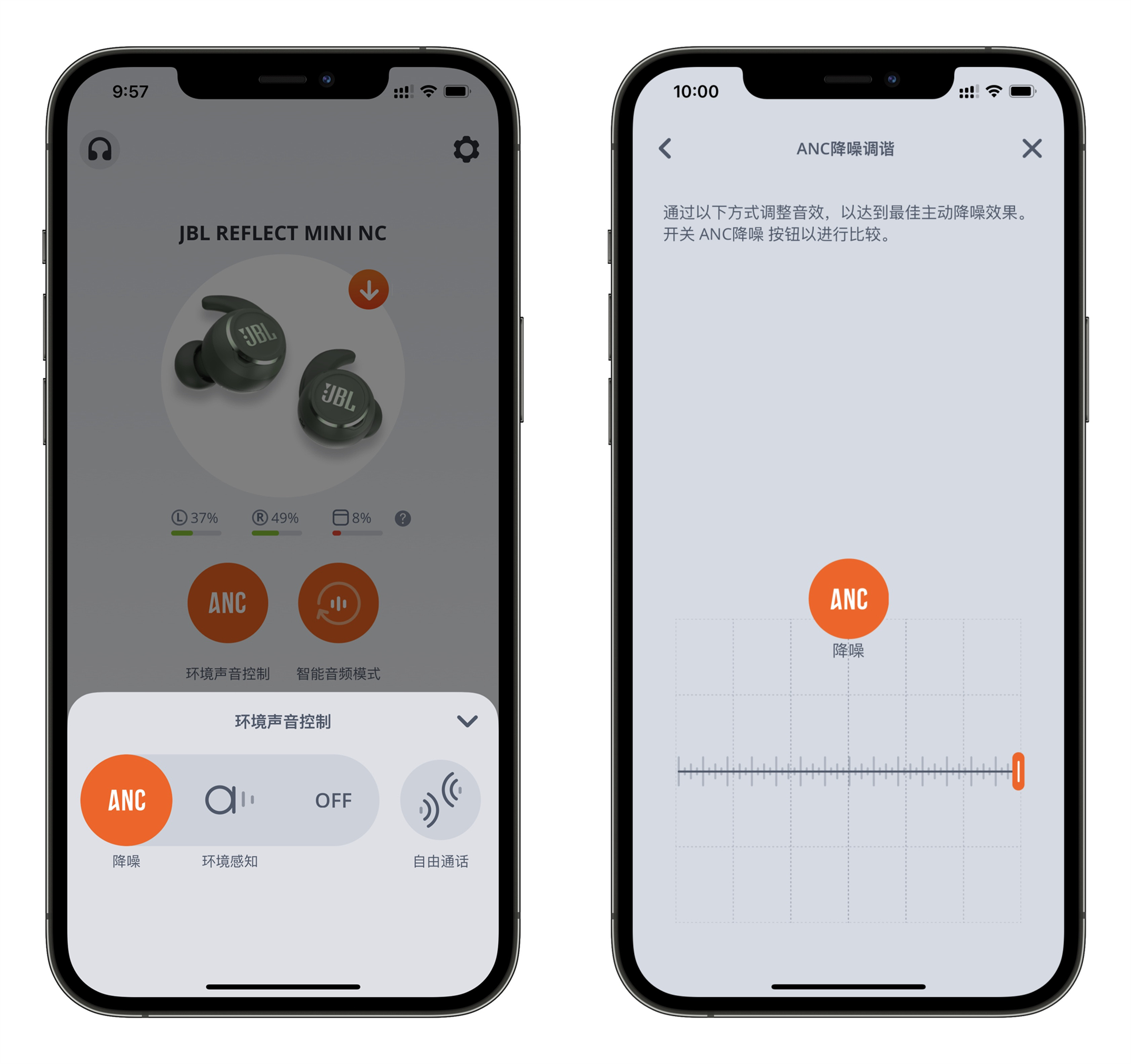 JBL REFLECT MINI NC太空舱加入了ANC主动降噪功能,结合My JBL Headphones控制,可以实现15级环境音可控降噪。通过软件开启ANC降噪功能后,左右移动调整降噪程度,通过15级调整,找到合适最佳的主动降噪效果,这是同价位耳机中非常罕见的。