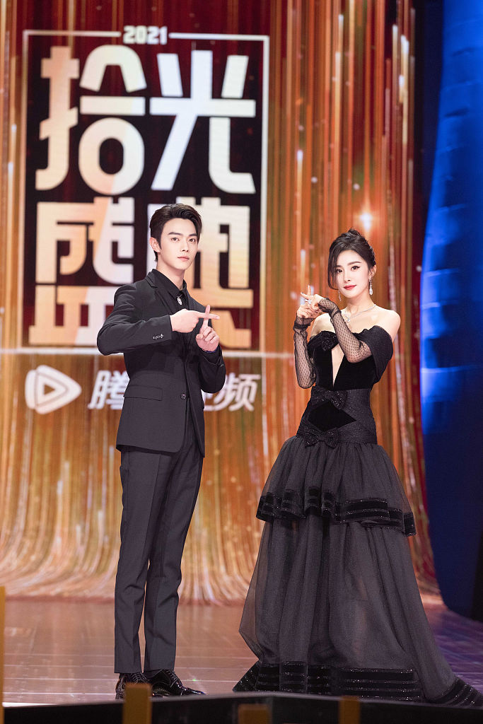 2021年6月7日,上海,许凯出席腾讯拾光盛典并拍摄造型写真,活动现场他与杨幂同台,两人一起比“十”的手势宣传新剧《爱的二八定律》。