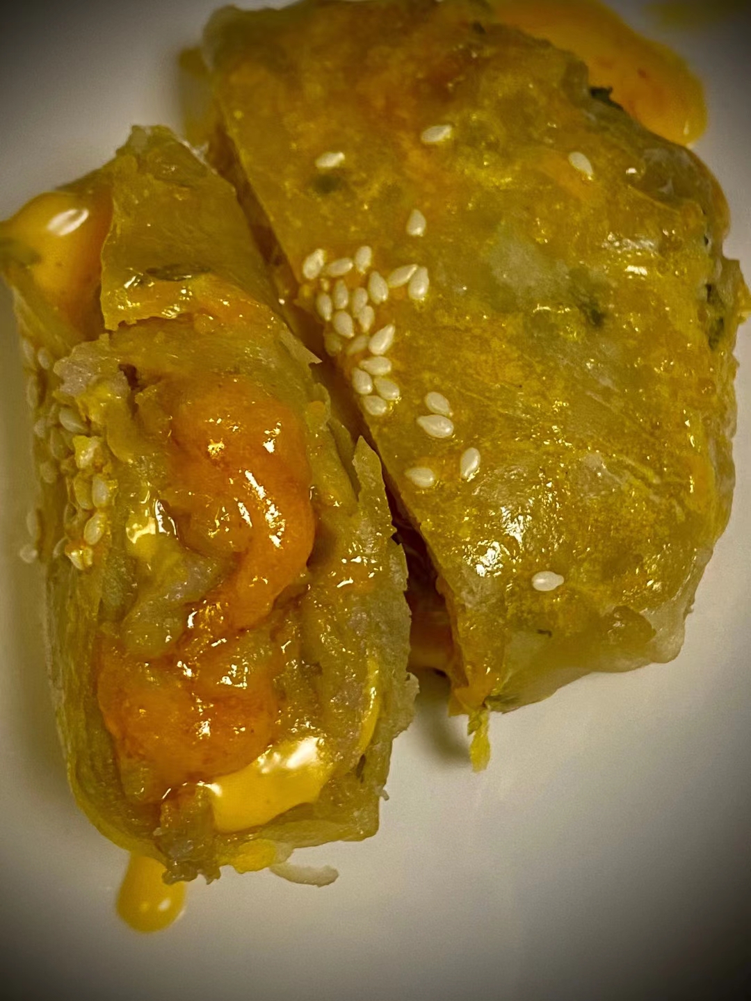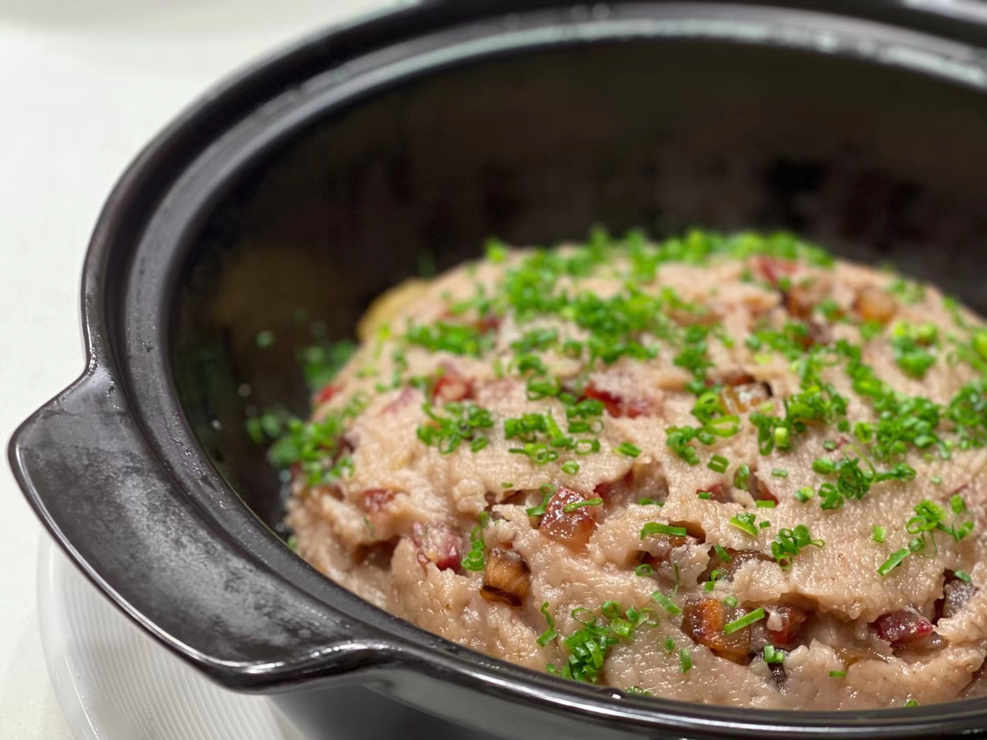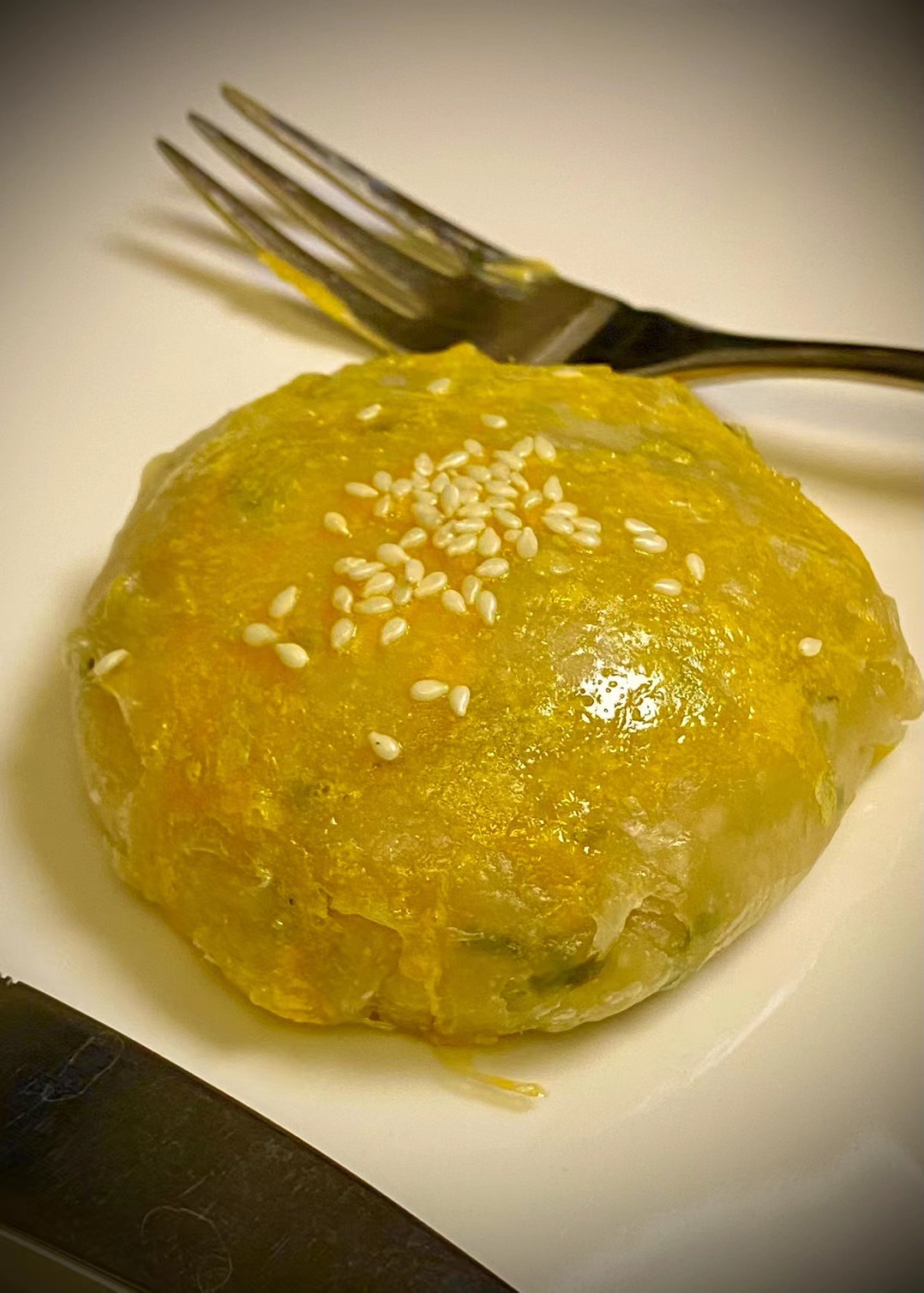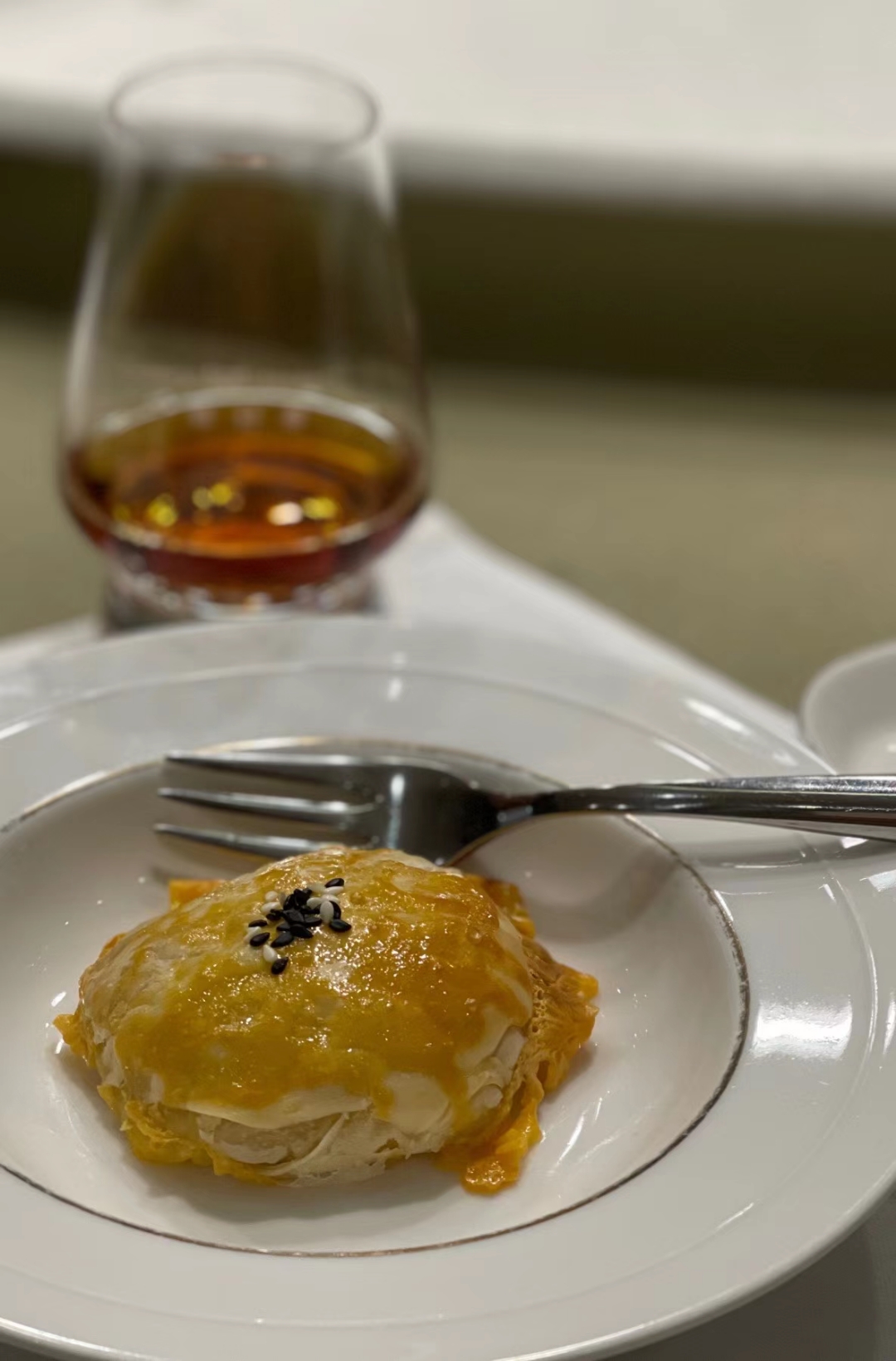 第二道芋泥菜是芋泥酥:将芋泥和蔴薯泥、芝士搭配,在烤箱里烘烤,又香又甜又咸又腻。这是一种更趋于西式的味道,芋泥的细腻与蔴薯的柔韧,加上芝士藕断丝连般的缠绵,各自安分地扮演着自己的角色又互相衬托。食物是多元的,并非非此即彼,可以各自安好又互相衬托,前提是有好的烹饪。