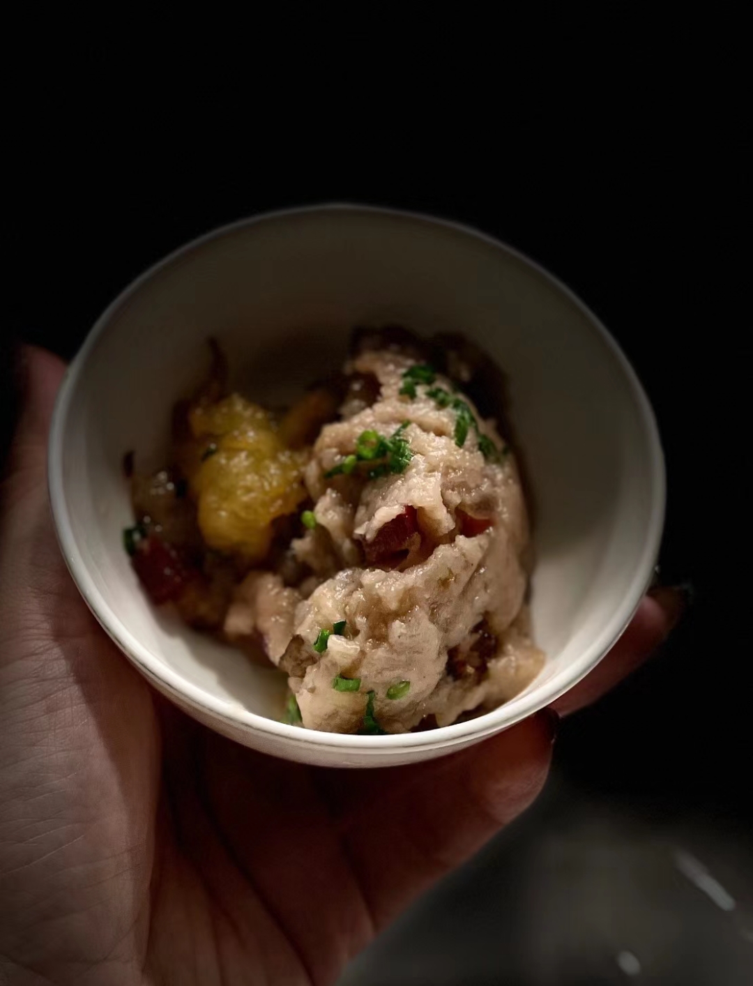 第一道芋泥——香草腊味芋泥:用广式腊肠和西餐用的香草,加上大量的牛油,做成了一道咸味芋泥。传统的芋泥,一般做成甜的,这道菜把它弄成咸的。来自广西荔浦的芋头、来自广东的腊肠、来自云南的黄牛肥肉,和来自欧洲的香草相遇,芋香、脂香、腊味香和草香混合,香得嘴巴爆胀,久久合不拢,芋头的绵糯和腊肠的颗粒感、牛油渣的碎片感,既有瞬间带来的香鲜冲击,又有越嚼越香的持续补充,让人欲罢不能,这是一碗要命的芋泥。