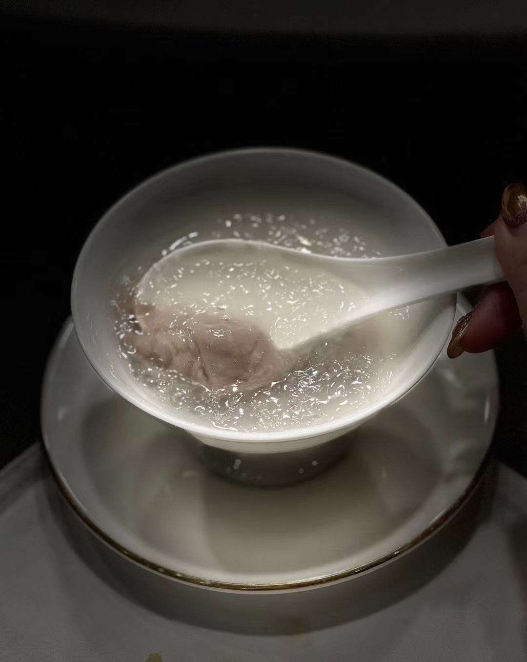 第三道芋泥——芋泥燕窝。这道菜的知识产权属于汕头东海酒家的钟成泉先生,蔡昊老师做了小小的改动——降低甜度。与喜欢脂肪一样,人类也天然地喜欢甜。传统的芋泥燕窝都很甜,以前潮汕人还将不够甜的甜味叫“痴哥甜”——弱得弱智般的甜!现代人对甜的口味偏好已经发生了改变,不喜欢太甜的食物,当然,还有部分人还是喜欢甜得发腻。众口难调,选择最大公约数,把甜度降下来是正确的。