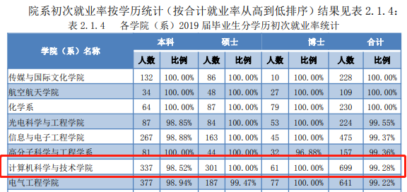 计算机科学与技术学院在2019届本硕博毕业生初次就业率统计可以看出,就业率是非常高的,尤其是硕士和博士毕业生就业率高达100%,本科生就业率也是高达98.52%,毕业生基本不用担心就业问题。