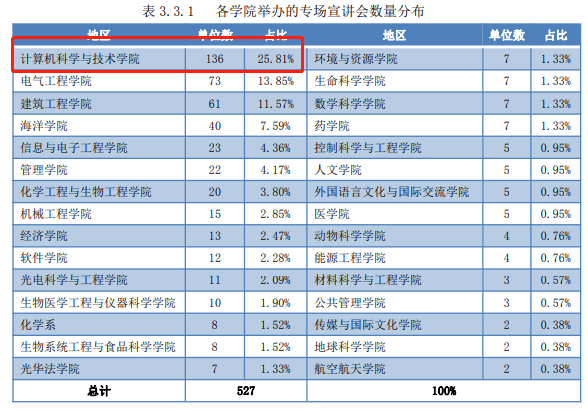 2019年在各学院举办的专场宣讲会数量,计算机学院招聘单位数高达136家,占比总数量的25.81%。