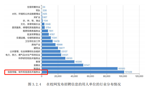 从发布招聘信息用人单位的行业来看,信息传输、软件和信息技术服务业是毕业生招聘需求最旺盛的领域。