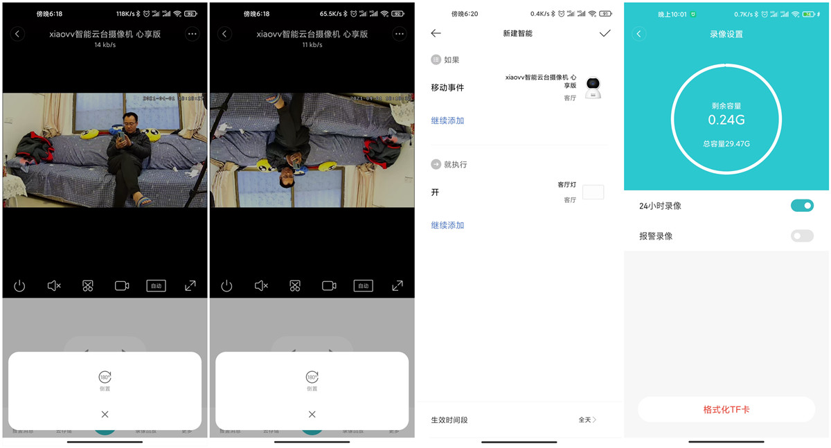 还有两个小功能挺不错,一是摄像机倒置安装时,可以在APP中将监控画面同步进行倒置,这样使用起来很方便;另外,这款摄像机还支持同其他智能家居产品智能联动,例如:摄像机监测到画面内有人走动,就自动打开某只灯具,这种就很适合晚上起夜的情况。等等智能联动功能,可以根据自己的需要进行配置