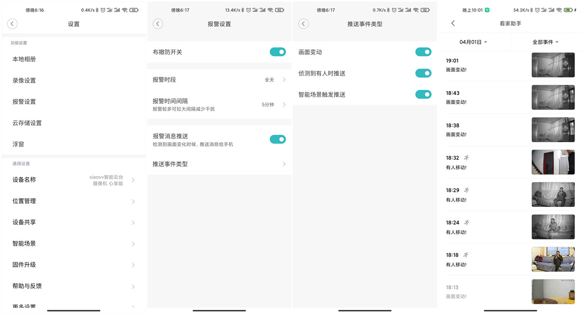 功能方面,相信很多小伙伴都用过智能摄像机,咱们就不多做赘述了,app内可以对摄像机安防办法进行自定义,选择不同的时间段进行监测推送,也可以实时查看监控画面以及之前的录像内容等等